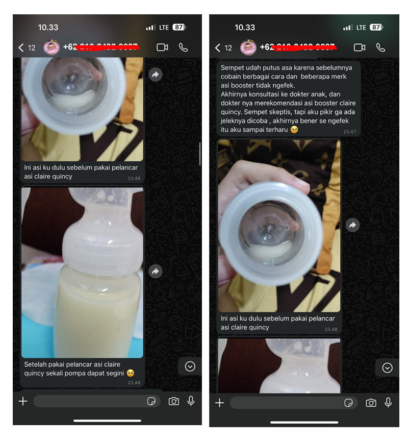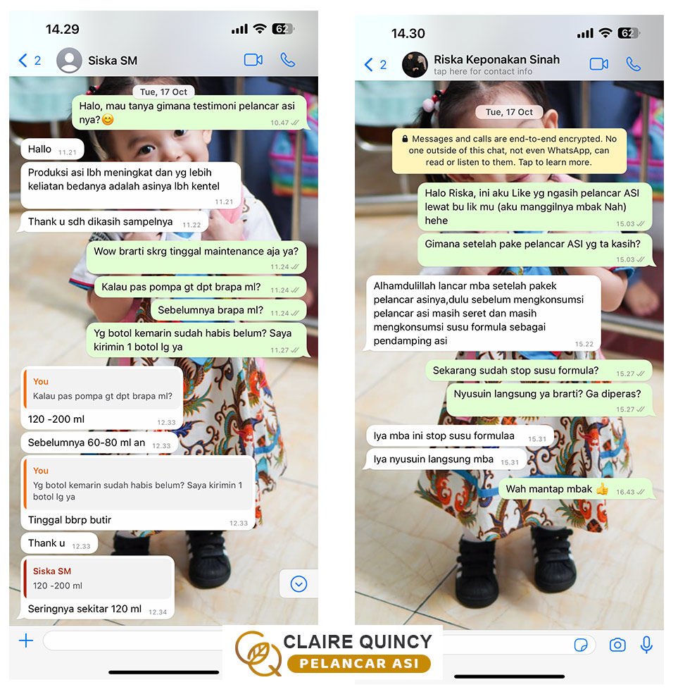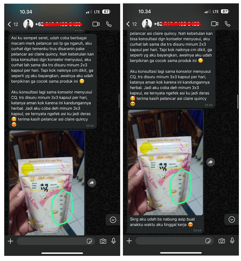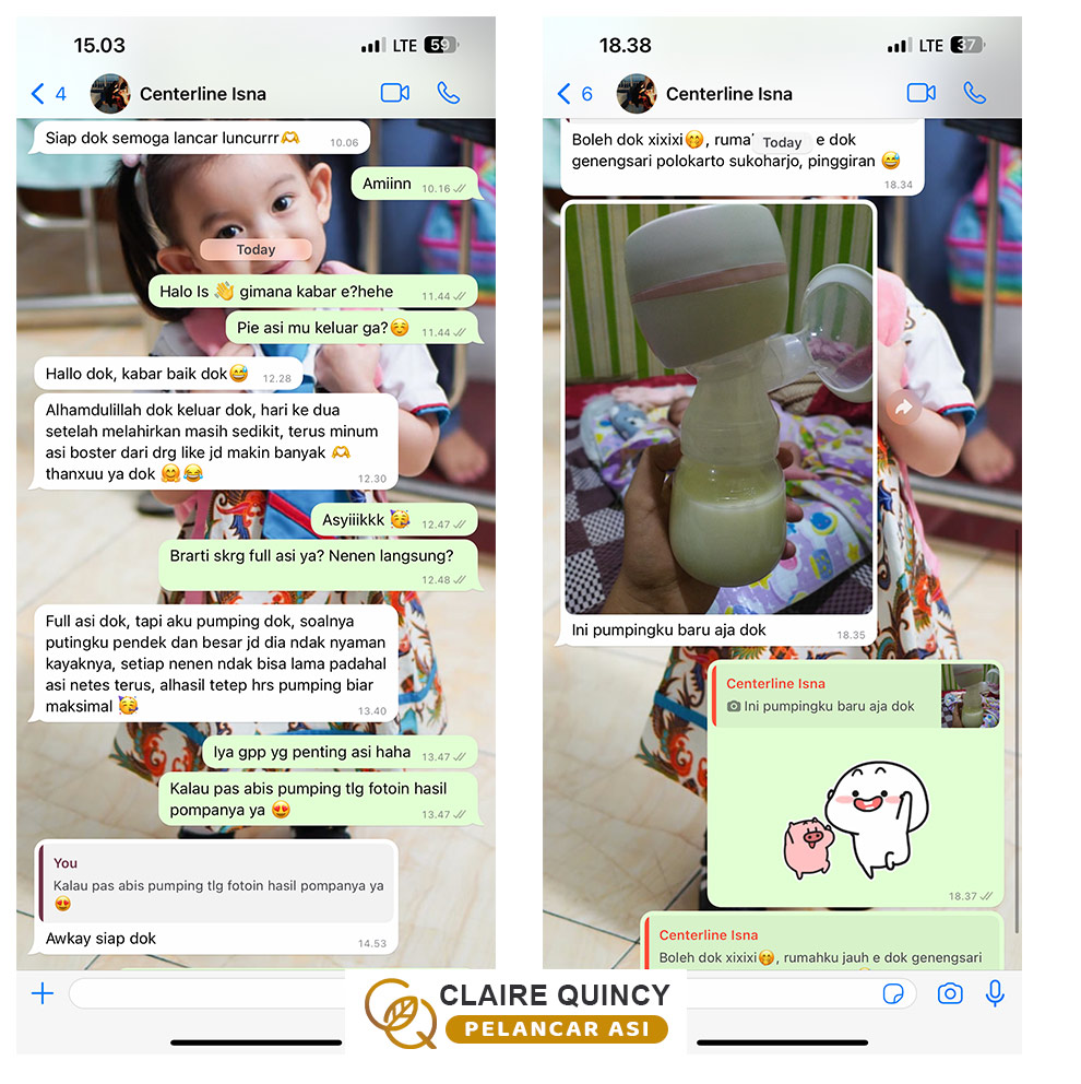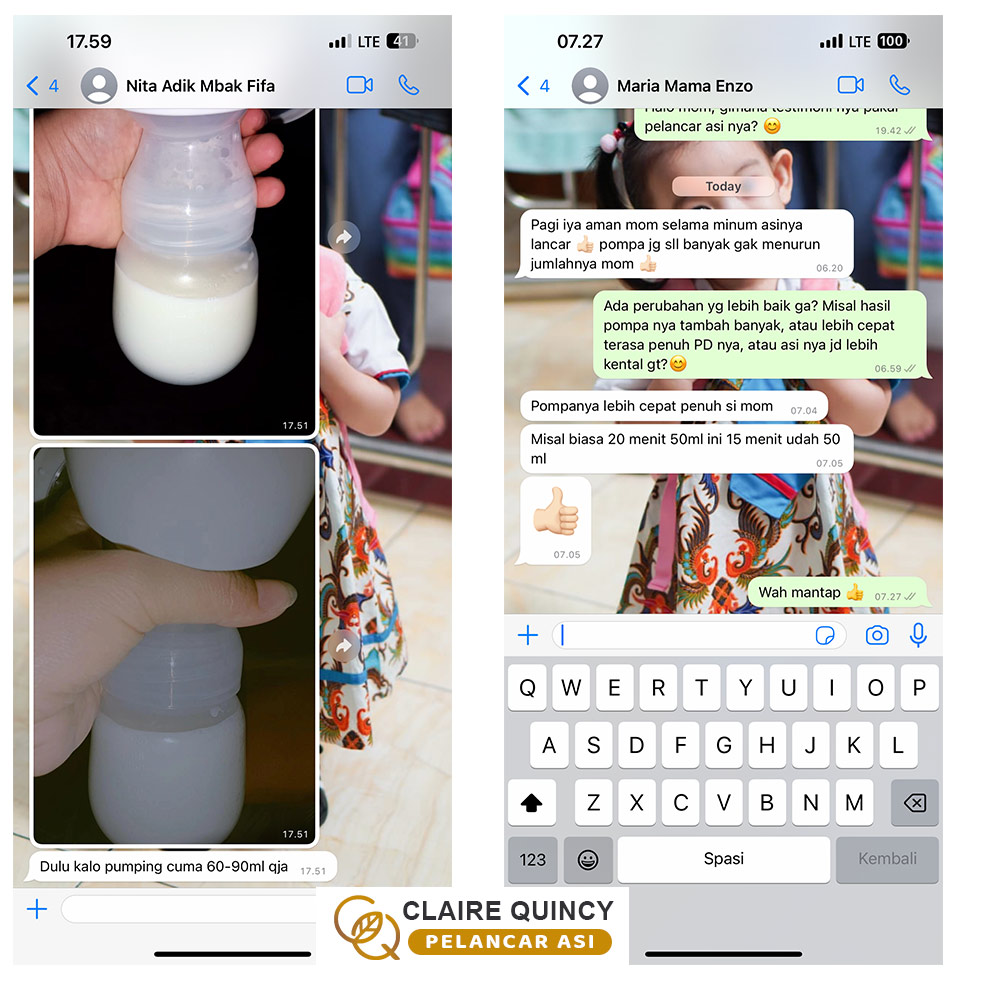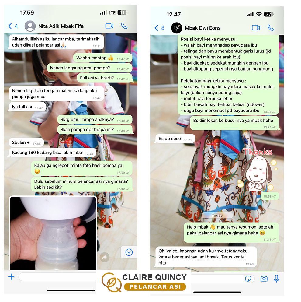 Temanku menjawab: “Aku dulu juga direkomendasikan oleh saudaraku Pelancar ASI Claire Quincy ini, dan se ngefek itu. ASI-ku jadi lancar dan kental, bahkan karena aku sudah pernah cobain beberapa macam ASI booster merk lain, makanya aku bisa tau mana yang paling bagus dan maksimal hasilnya.. Merk lain hasilnya tidak sebagus ASI Booster Claire Quincy.. Jadi merk lain ini ada yang hanya membuat kental tapi ASI tidak banyak, ada yang tidak ngefek sama sekali, dan ada juga yang hanya membuat ASI banyak tapi tidak kental.. Jadi ASI Booster Claire Quincy inilah yang paling memuaskan hasilnya, yaitu ASI ku produksinya menjadi paling banyak dan ASI paling kental. Makanya ASI Booster Claire Quincy ini sampai berani ngasih jaminan garansi uang kembali kan.”