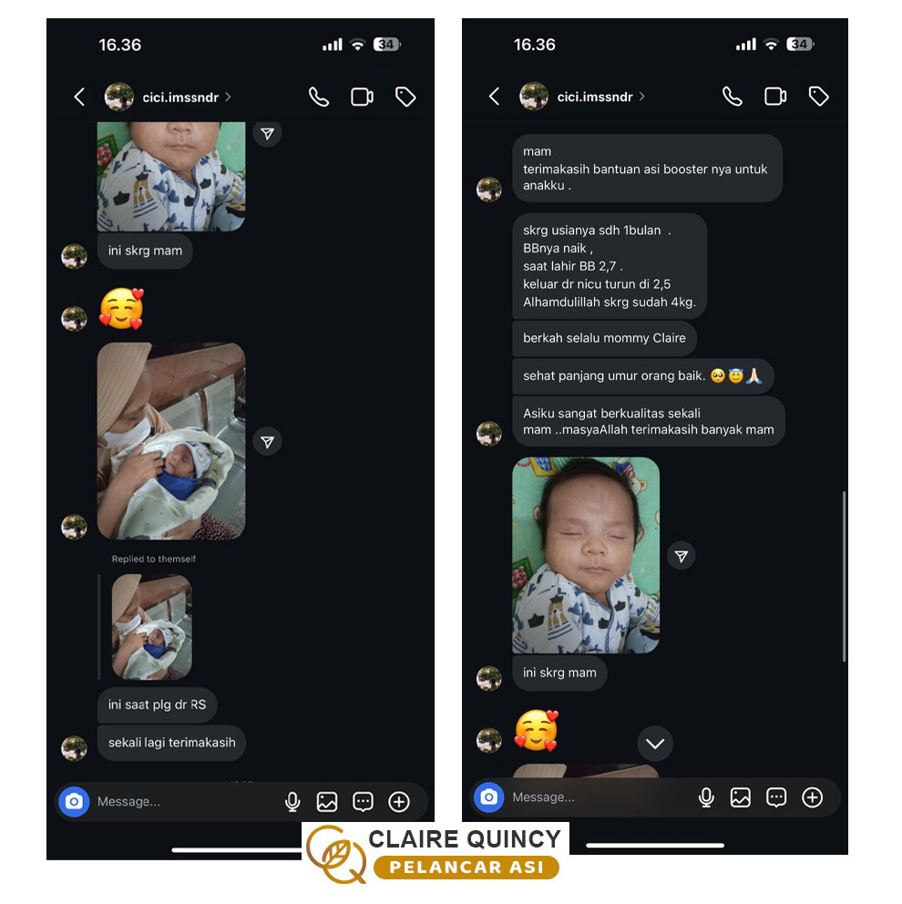 Aku ada DM 6 orang, tetapi yang membalas DM-ku hanya 2 orang, dan benar keduanya menceritakan ASI-nya di awal tidak keluar sama sekali tetapi setelah mengkonsumsi pelancar ASI Claire Quincy ini menjadi lancar. Aku sangat berterima kasih pada kedua orang tersebut yang sudah membalas DM-ku walau tidak mengenal diriku 😊